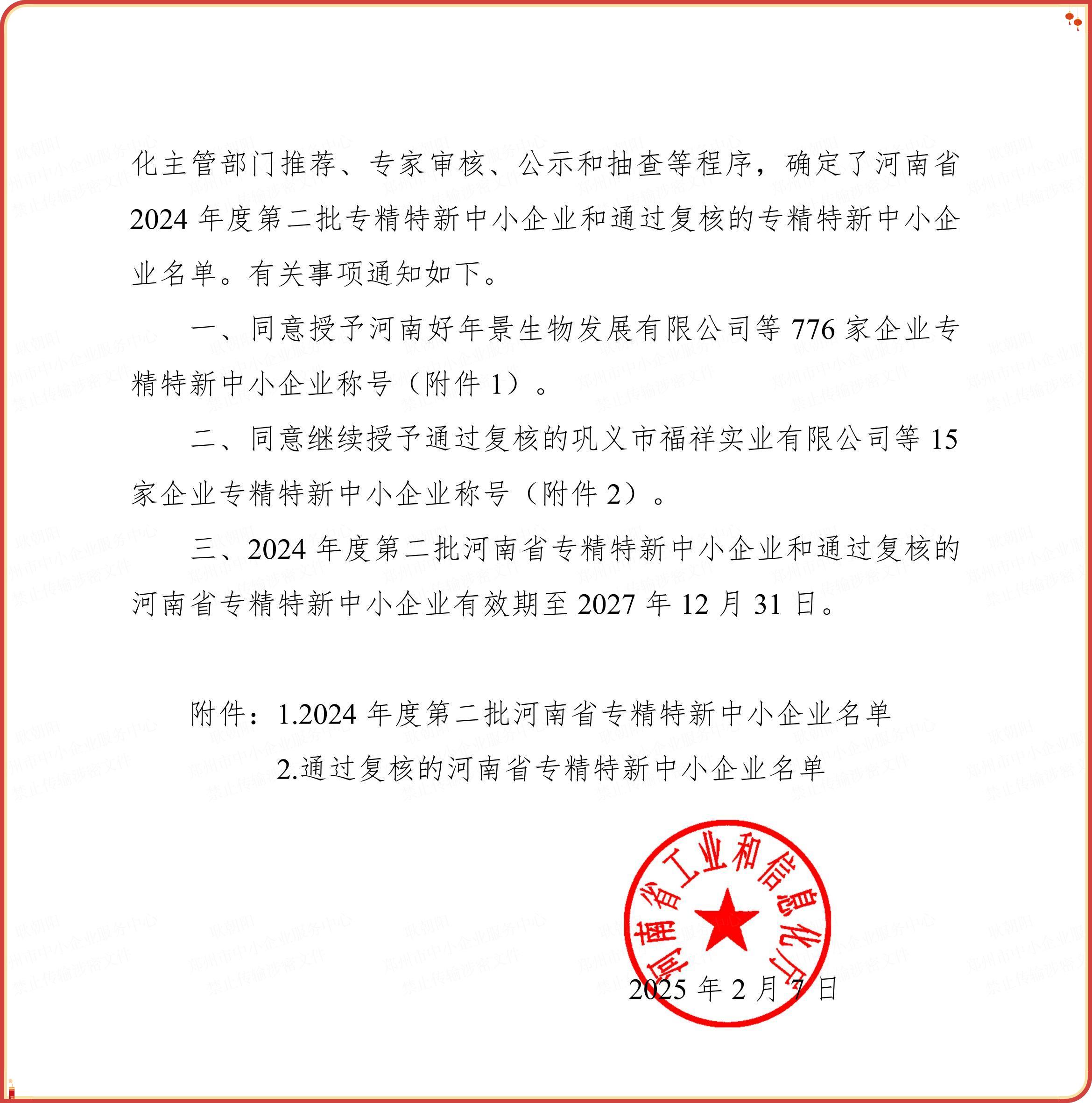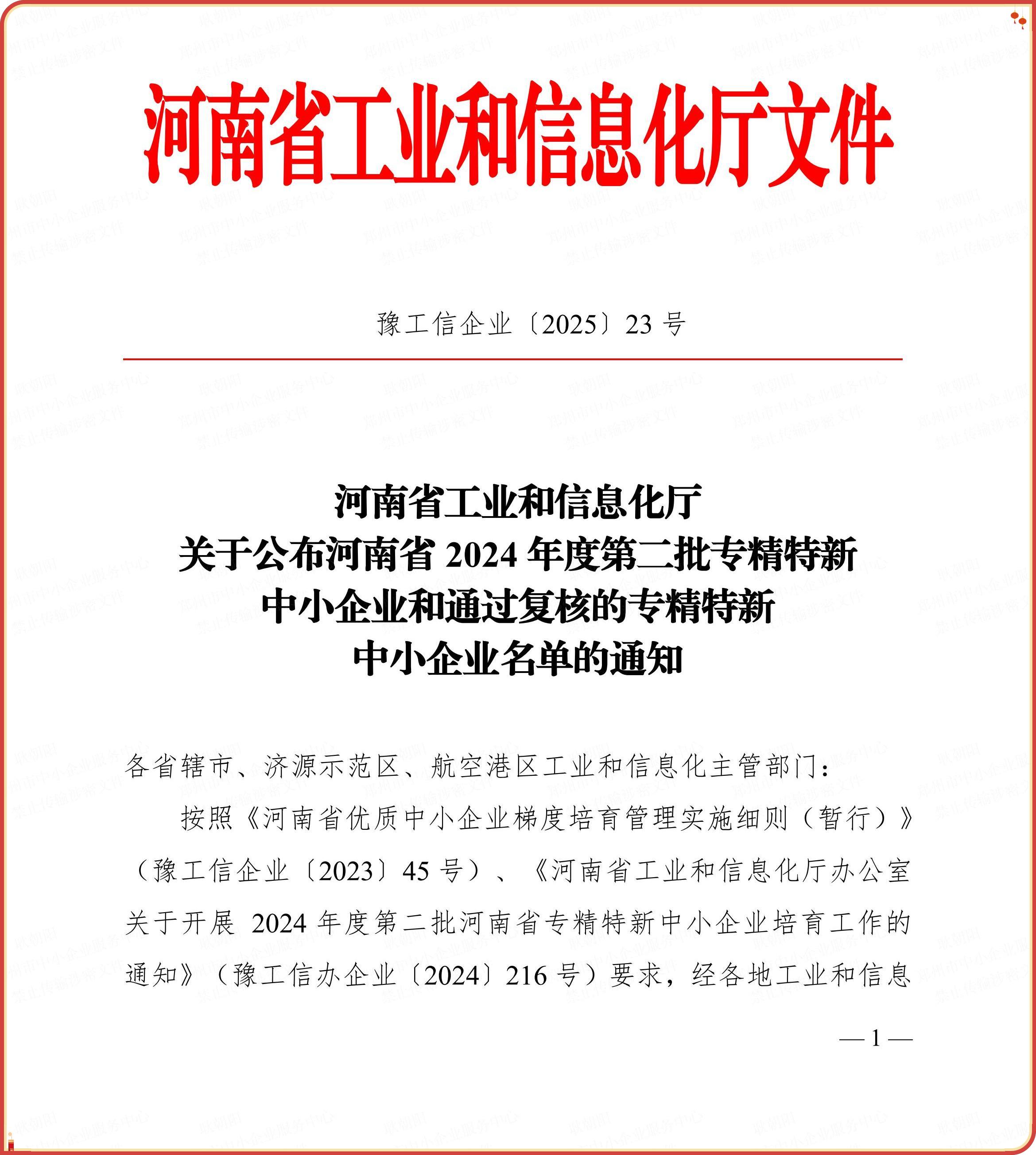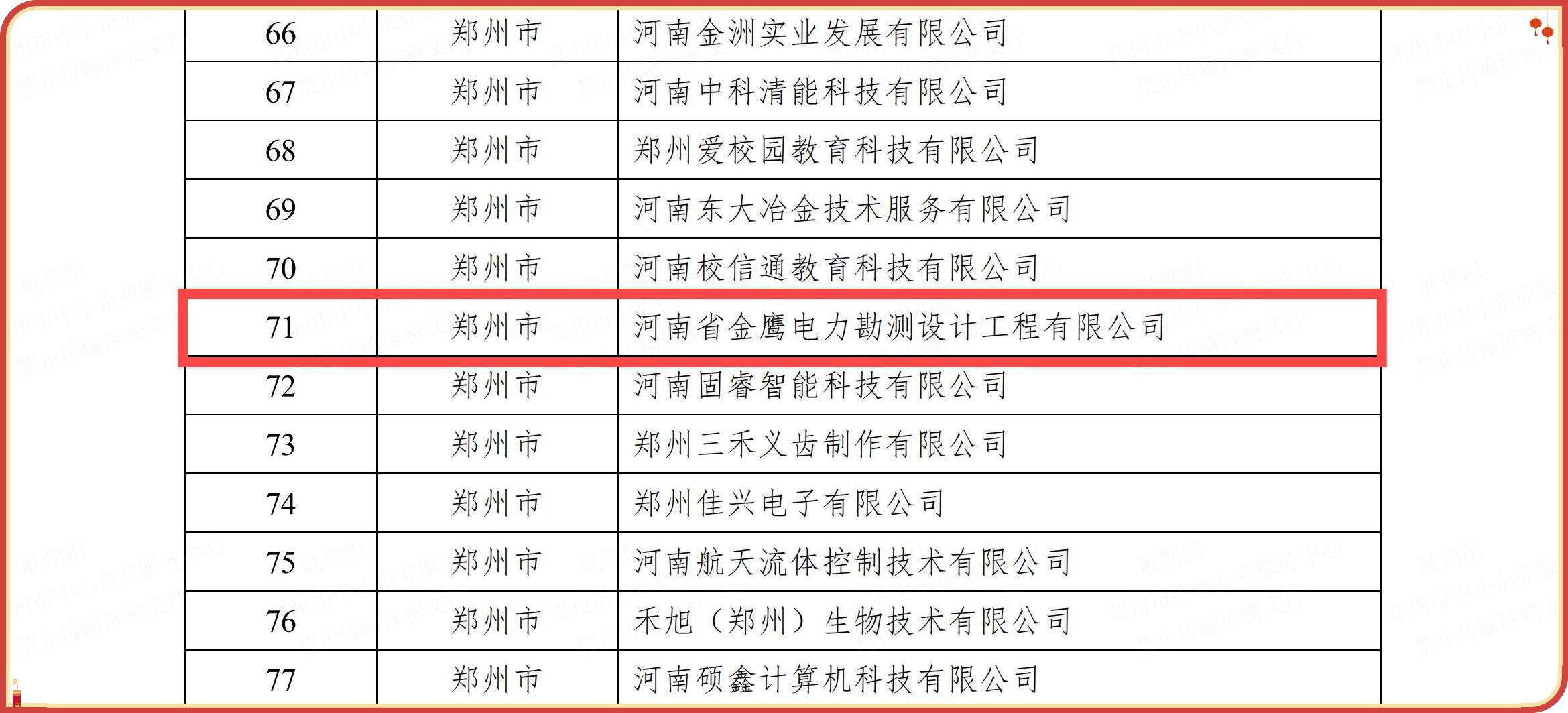 近日,河南省工信厅公布了2024年度第二批河南省专精特新中小企业认定名单,金鹰公司凭借在电力行业的杰出表现和技术创新能力,成功荣获“河南省专精特新中小企业”称号。
